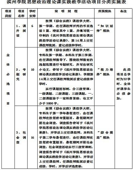 对于本课程而言,关键在于实践教学活动各个环节的管理是否明确、严格。为此,本课程按照“营养配餐法”分类实施办法,制订了各实践活动项目的操作规程。以“全体必选项目”为例,列表如下: