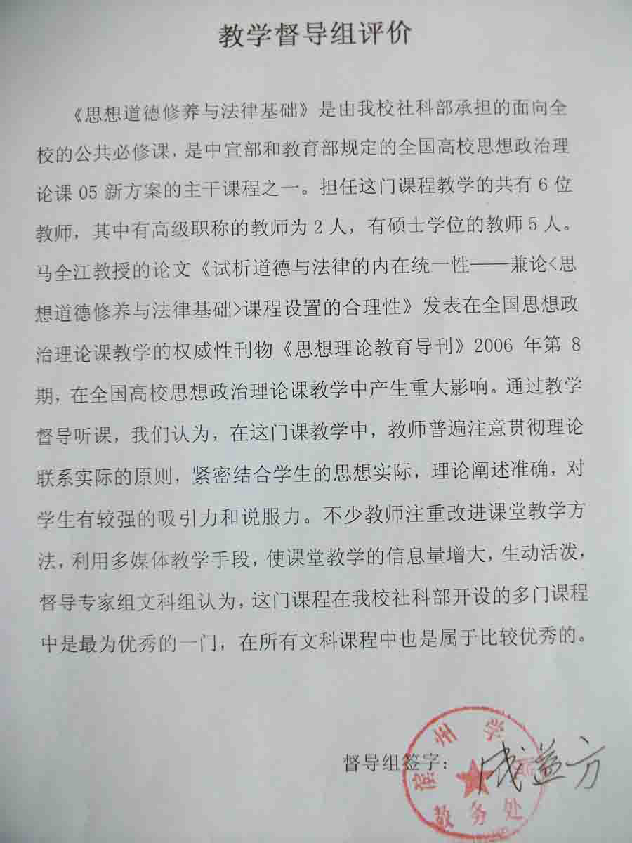 “思想道德修养与法律基础”是由我校社科部承担的面向全校的公共必修课,是中宣部和教育部规定的全国高校思想政治理论课05新方案的主干课程之一。担任这门课程教学的共有8位教师,其中有高级职称的教师为4人,有硕士学位的教师7人。马全江教授的论文《试析道德与法律的内在统一性——兼论<思想道德修养与法律基础>课程设置的合理性》发表在全国思想政治理论课教学的权威性刊物《思想理论教育导刊》2006年第8期,在全国高校全国思想政治理论课教学中产生重大影响。通过教学督导听课,我们认为,在这门课教学中,教师普遍注意贯彻理论联系实际的原则,紧密结合学生的思想实际,理论阐述准确,对学生有较强的吸引力和说服力。不少教师注重改进课堂教学方法,利用多媒体教学手段,使课堂教学的信息量增大,生动活泼,督导专家组文科组认为,这门课程在我校社科部开设的多门课程中是最为优秀的一门,在所有文科课程中也是属于比较优秀的。