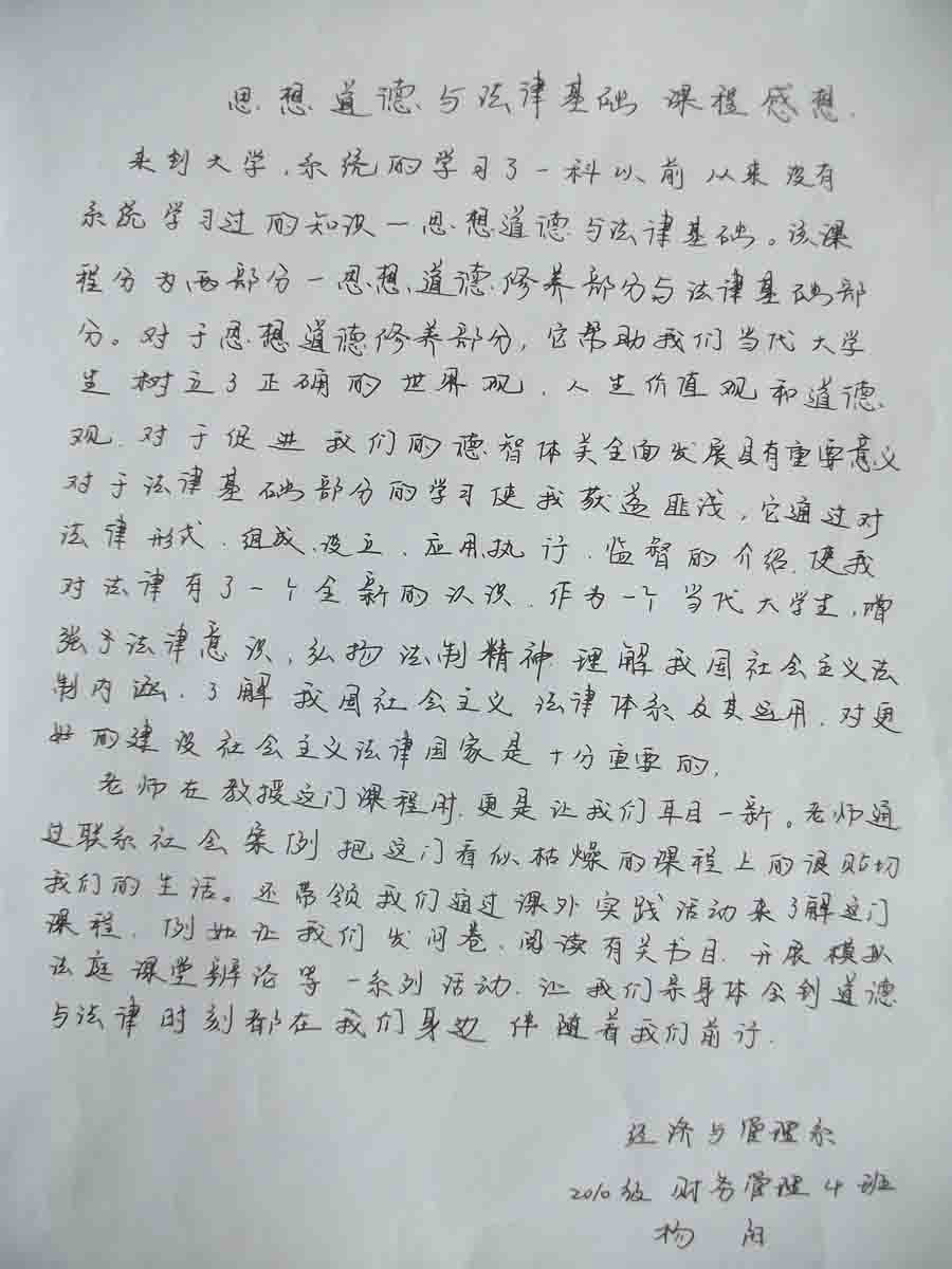 2010级财务管理4班杨阳同学说:走到大学,系统地学习了一门以前从来没有系统学习过的知识——思想道德修养与法律基础。该课程分为两部分:思想道德修养部分与法律基础部分。对于思想道德修养部分,它帮助我们当代大学生树立正确的世界观、人生价值观和道德观,对于促进我们的德智体美全面发展具有重要的意义。对于法律基础部分的学习使我获益匪浅,它通过对法律形式、组成、建立、应用执行、监督的介绍,使我对法律有了一个全新的认识。作为一个当代大学生,增强法律意识、弘扬法治精神,理解我国社会主义法律内涵,了解我国社会主义法律体系及其应用,对建设社会主义法治国家是十分重要的。老师在教授这门课程时,更是让我们耳目一新,老师通过联系社会案例,把这门看似很枯燥的课程上得很贴近我们的生活。还带领我们通过课外实践活动来了解这门课程,例如让我们发问卷、阅读有关书目、开展模拟法庭、课堂辩论等一系列活动,让我们亲身体会到道德和法律时刻在我们身边,伴随着我们前行。
