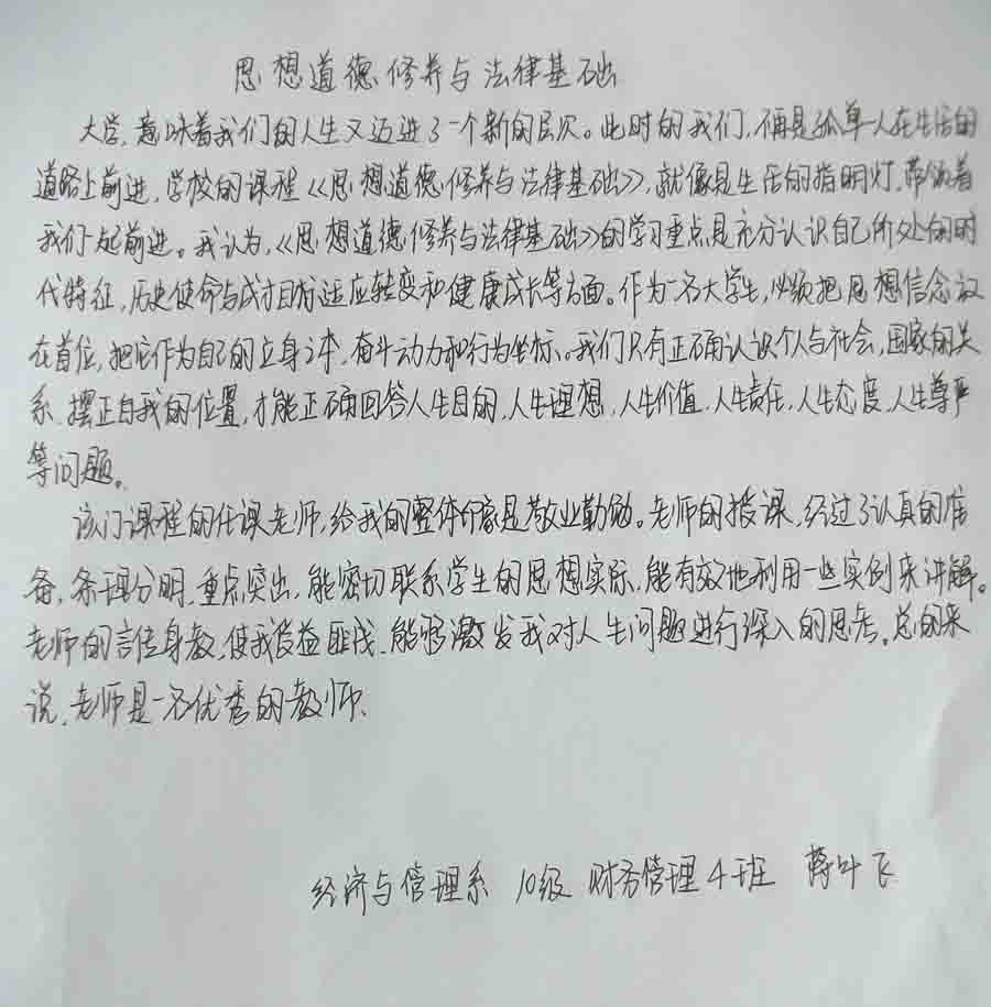 2010级财务管理4班蒋叶飞同学说,大学,意味着我们的人生又迈上了一个新的层次,此时的我们不再是一个人在生活道路上前行,《思想道德修养与法律基础》就像是生活里的明灯,带领我们一起前进。我认为《思想道德修养与法律基础》的学习重点是认识我们所处的时代特征、历史使命等。我们只有正确认识个人与社会、国家的关系,摆正自我位置,才能正确回答人生目的、人生价值、人生责任等问题。我们课程的授课老师给我的整体感觉是敬业勤勉。老师的授课经过了充分准备,条理分明、重点突出,能密切联系学生实际,结合实例讲解。老师的言传身教,使我受益匪浅,能够激发我对人生问题的深入思考。总的来说,老师是一名优秀的教师。