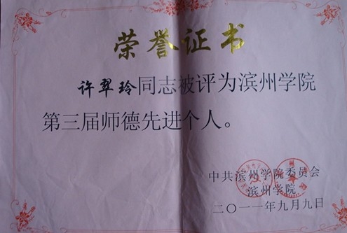 1.师德先进个人,滨州学院工会,2011.9;